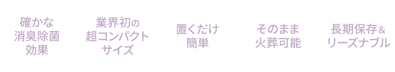 永遠のやすらぎ(以下本品)は特殊製法を施した機能性二酸化塩素が空気中の水分と化学反応を起こすことで、お柩内の臭いの元となる大腸菌や黄色ブドウ球菌などを強力&即効で除菌します。そして最大5日間にもわたって臭いの発生源を除菌し続ける長い持続力も実現しました。